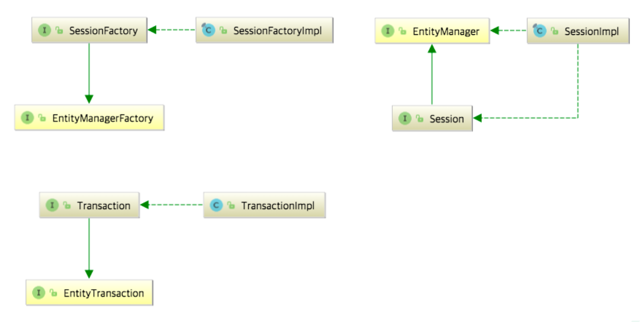 Hibernate에서는 각각 SessionFatory, Session, Transaction으로 상속받아 구현하고 있다.