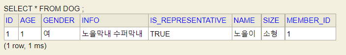 이것이 위에서 말했던 외래키(FK)의 개념이며, Dog Entity에 있는 Member member라는 컬럼이 외래키 역할을 할 것이고,