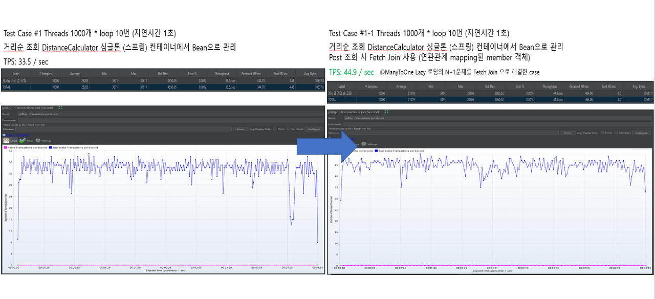 * 게시글 거리순 조회 : 33.5 TPS - 해당 API 요청의 쿼리를 찍어보았는데, post 객체를 JPA QueryMethod로 findAll() 할 때, post 객체에 @ManyToOne